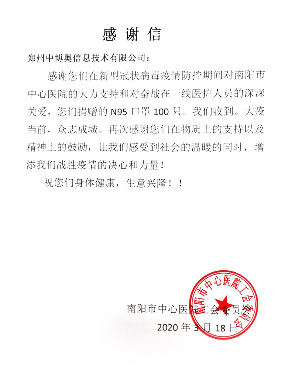 抗疫“戰(zhàn)爭”期間,在全國醫(yī)療衛(wèi)生設(shè)備緊缺的情況下,我公司積極的盡到企業(yè)的責(zé)任與義務(wù),向南陽市中心醫(yī)院捐贈了一些醫(yī)療衛(wèi)生用品,為抗擊疫情,守護(hù)我們的白衣天使,盡到了一些微薄之力,能夠收到醫(yī)院的感謝信,我們感到非常的榮幸,其實我們更應(yīng)該感謝為疫情披荊斬棘的逆行者,是你們守護(hù)了我們大家的健康。